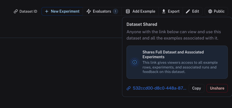 Sharing a dataset publicly will make it accessible to anyone with the link. Make sure you're not sharing sensitive information. This link gives viewers access to all example rows, experiments, and associated runs and feedback on this dataset. This feature is only available in the cloud-hosted version of LangSmith.